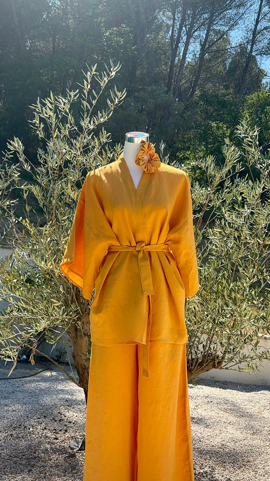 ENSEMBLE KIMONO JAUNE 100% LIN